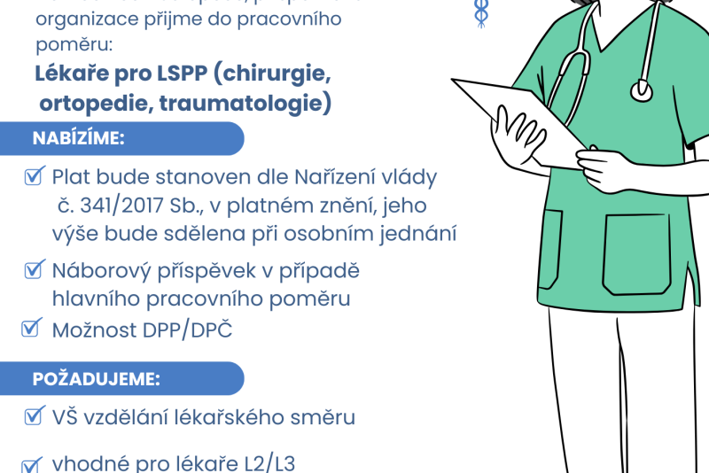 Přijmeme do pracovního poměru Lékaře pro LSPP (chirurgie, ortopedie, traumatologie).